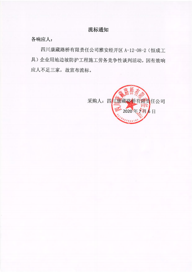 四川康藏路橋有限責(zé)任公司雅安經(jīng)開區(qū)A-12-08-2(恒成工具)企業(yè)用地邊坡防護工程施工勞務(wù)流標通知
