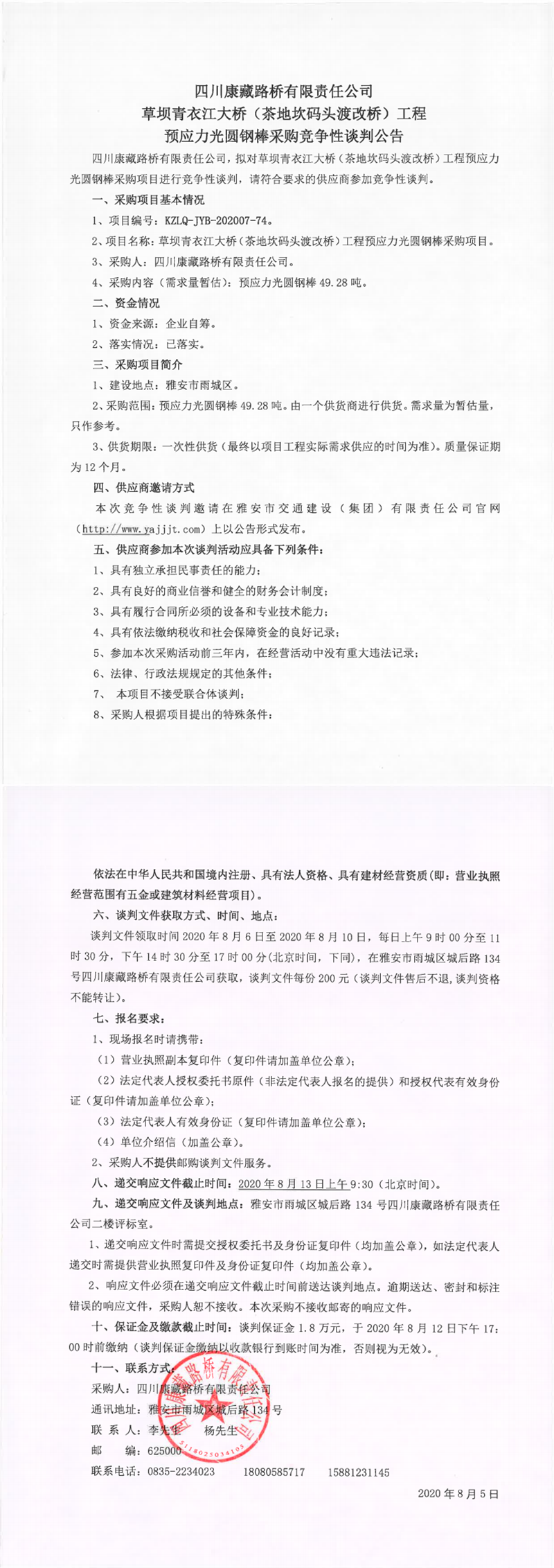 四川康藏路橋有限責(zé)任公司草壩青衣江大橋(茶地坎碼頭渡改橋)工程預(yù)應(yīng)力光圓鋼棒采購(gòu)競(jìng)爭(zhēng)性談判公告