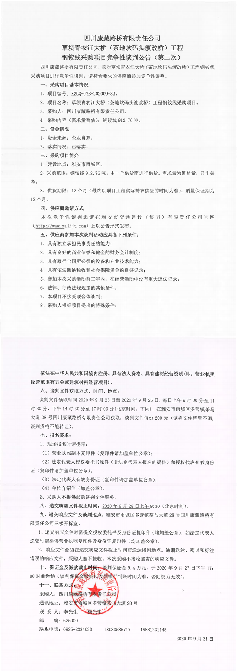 四川康藏路橋有限公司草壩青衣江大橋(茶地坎碼頭渡改橋)工程鋼鉸線采購(gòu)項(xiàng)目競(jìng)爭(zhēng)性談判公告(第二次)