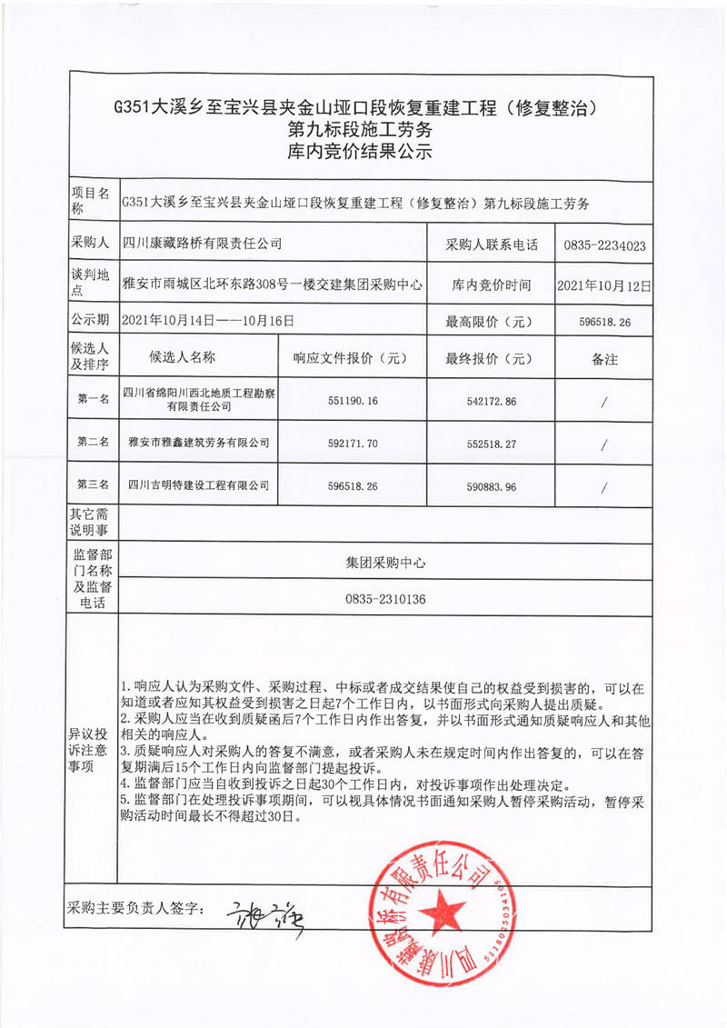 四川康藏路橋有限責(zé)任公司G351大溪鄉(xiāng)至寶興縣夾金山埡口段恢復(fù)重建工程(修復(fù)整治)第九標(biāo)段施工勞務(wù)庫內(nèi)競價結(jié)果公示