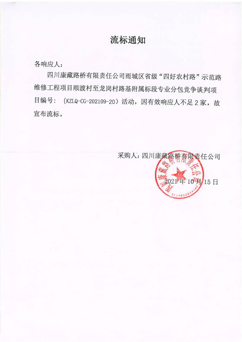 四川康藏路橋有限責任公司雨城區(qū)省級“四好農村路”示范路維修工程項目順渡村至龍崗村路基附屬標段專業(yè)分包流標通知