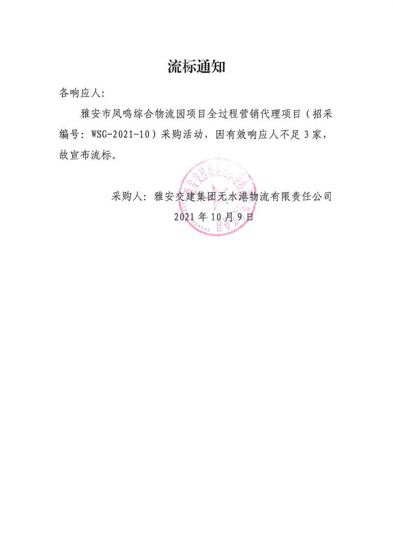 雅安交建集團(tuán)無水港物流有限責(zé)任公司雅安市鳳鳴綜合物流園項(xiàng)目全過程營銷代理項(xiàng)目流標(biāo)通知