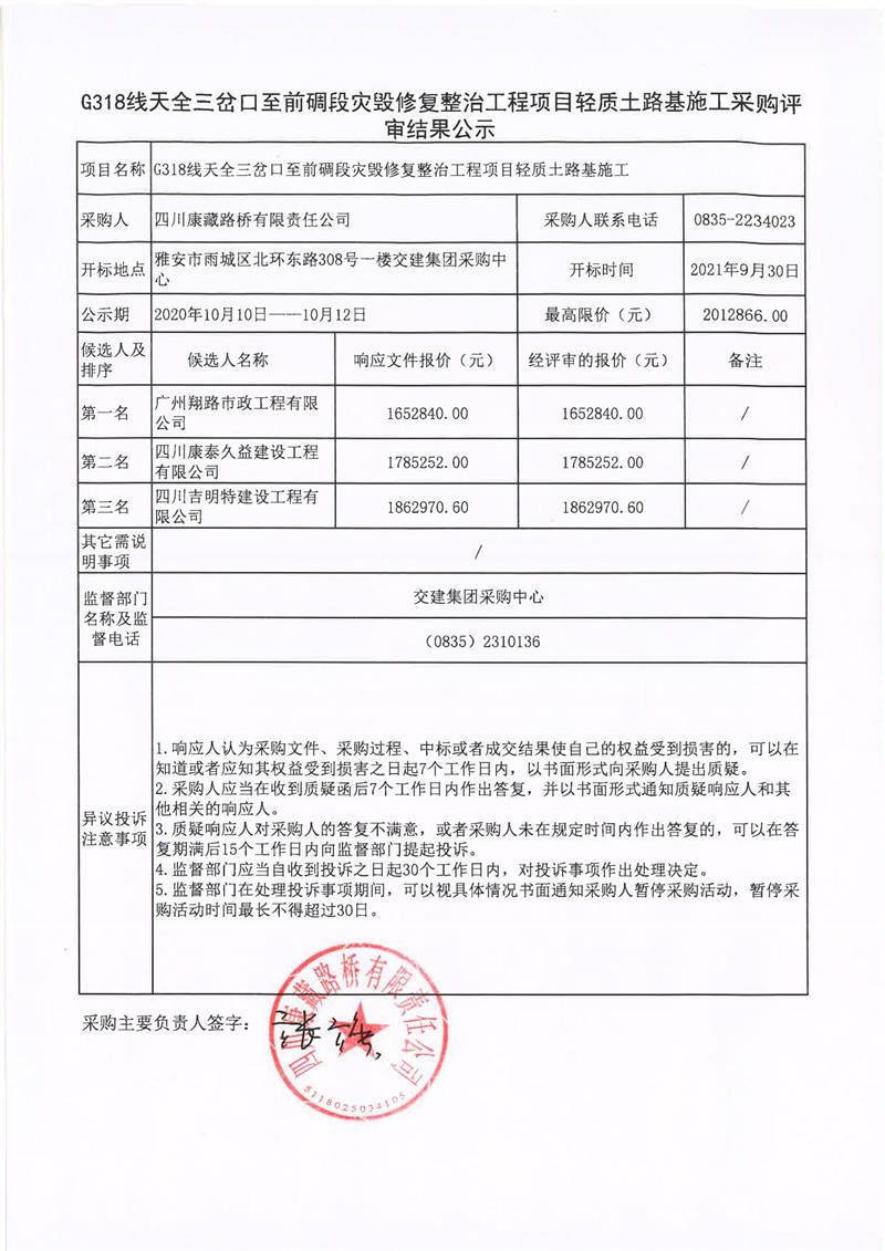 四川康藏路橋有限責任公司G318線天全三岔口至前碉段災(zāi)毀修復(fù)整治工程項目輕質(zhì)土路基施工采購評審結(jié)果公示