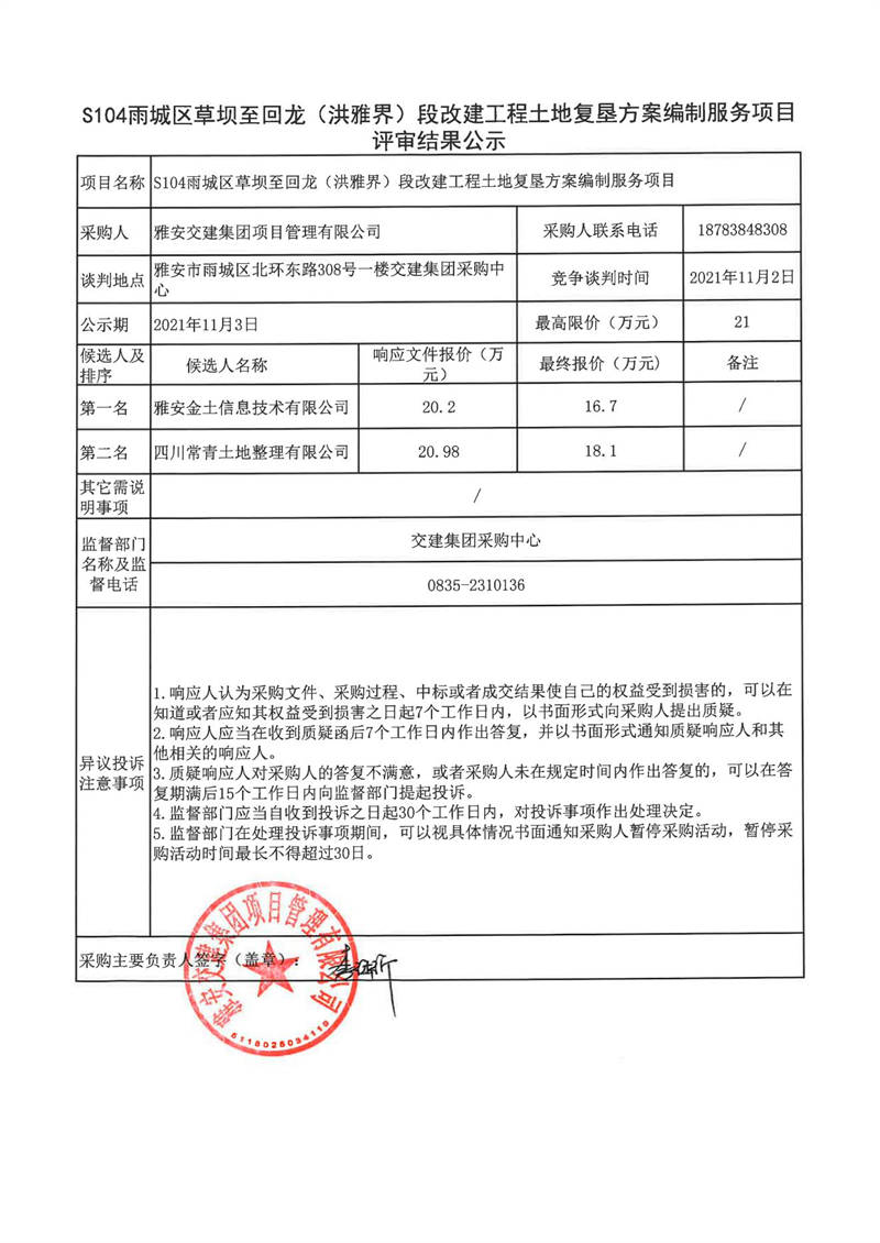 雅安交建集團(tuán)項(xiàng)目管理有限公司S104雨城區(qū)草壩至回龍(洪雅界)段改建工程土地復(fù)墾方案編制服務(wù)項(xiàng)目評審結(jié)果公示