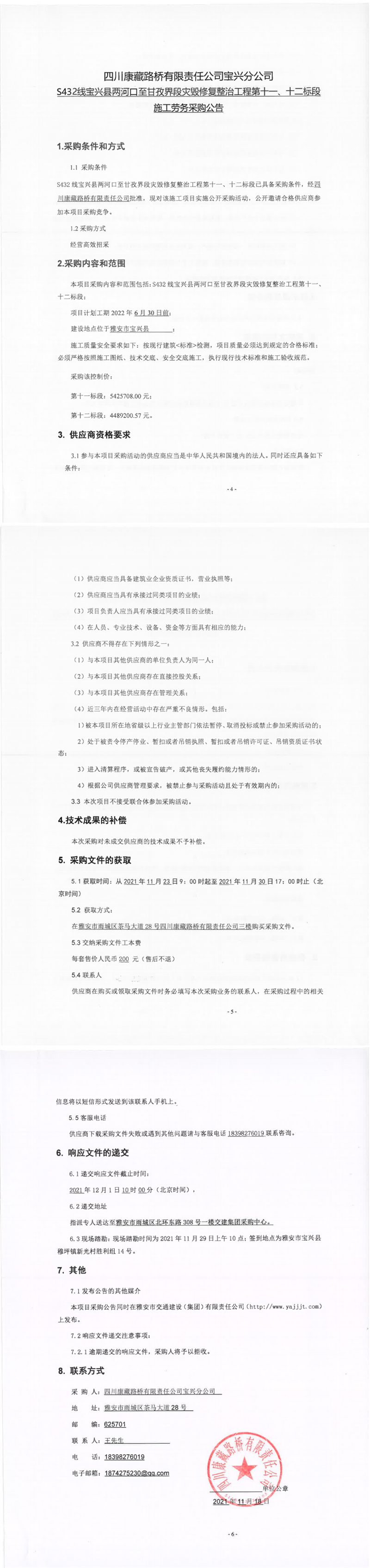 四川康藏路橋有限責(zé)任公司寶興分公司S432線寶興縣兩河口至甘孜界段災(zāi)毀修復(fù)整治工程第十一、十二標(biāo)段施工勞務(wù)采購公告