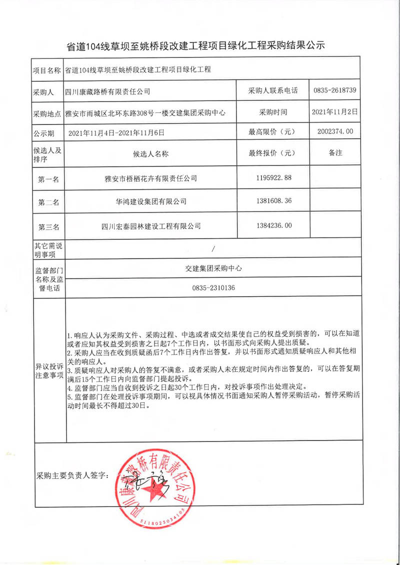 四川康藏路橋有限責任公司省道104線草壩至姚橋段改建工程項目綠化工程采購結(jié)果公示