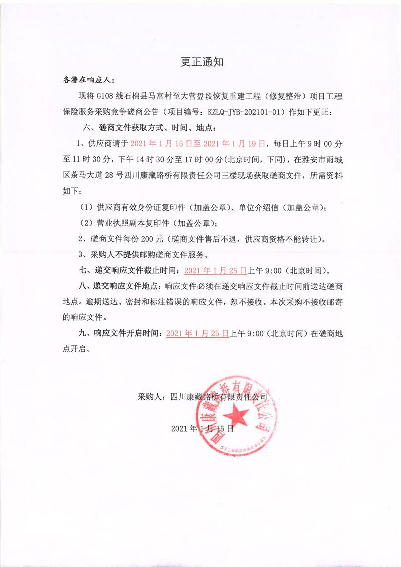四川康藏路橋有限責(zé)任公司G108線石棉縣馬富村至大營盤段恢復(fù)重建工程(修復(fù)整治)項目工程保險服務(wù)采購更正通知