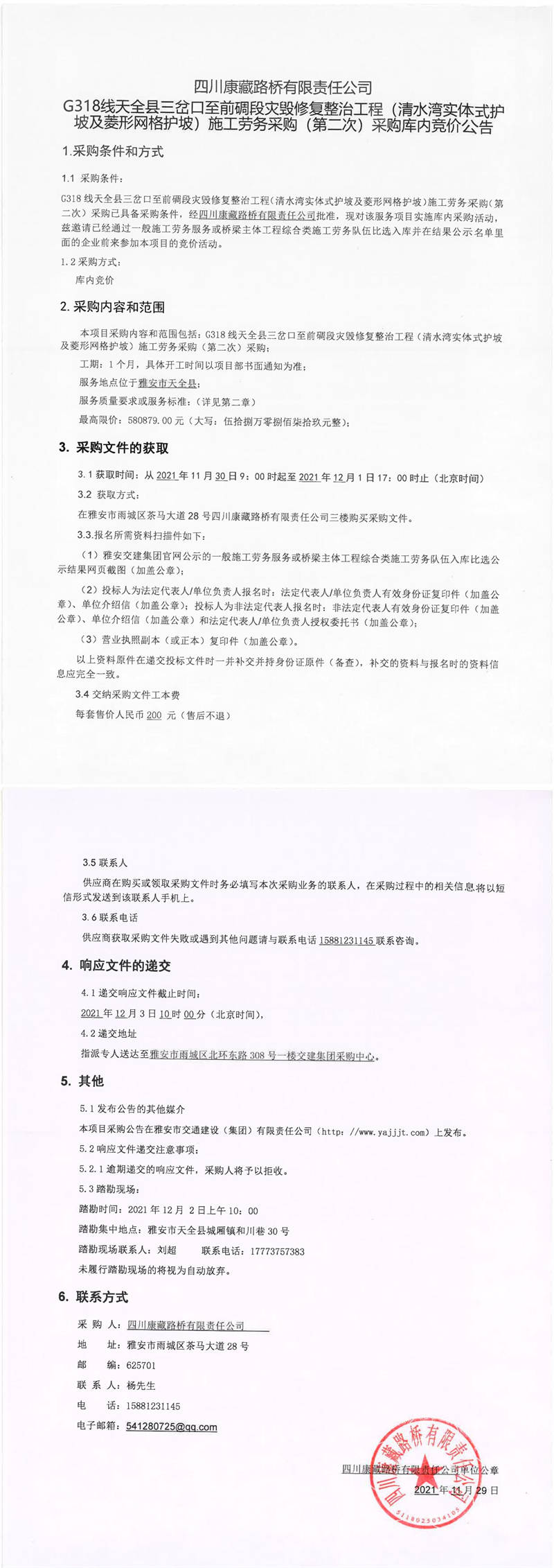 四川康藏路橋有限責(zé)任公司G318線天全縣三岔口至前碉段災(zāi)毀修復(fù)整治工程(清水灣實體式護(hù)坡及菱形網(wǎng)格護(hù)坡)施工勞務(wù)采購(第二次)采購庫內(nèi)競價公告