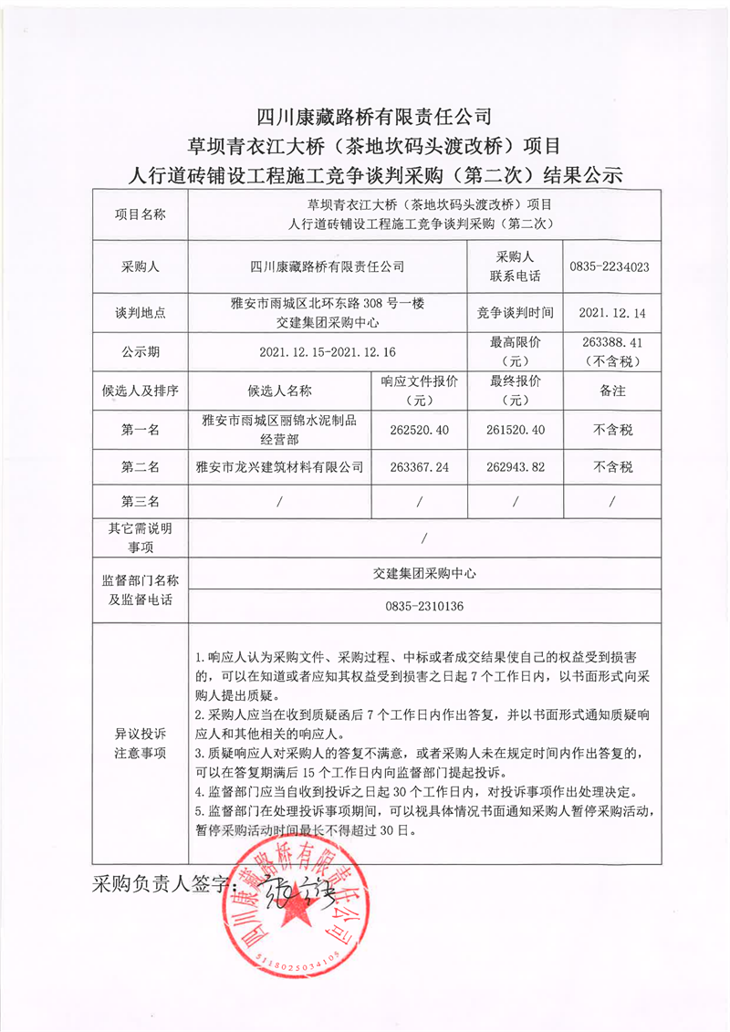 四川康藏路橋有限責任公司草壩青衣江大橋(茶地坎碼頭渡改橋)項目人行道磚鋪設工程施工競爭談判采購(第二次)結果公示
