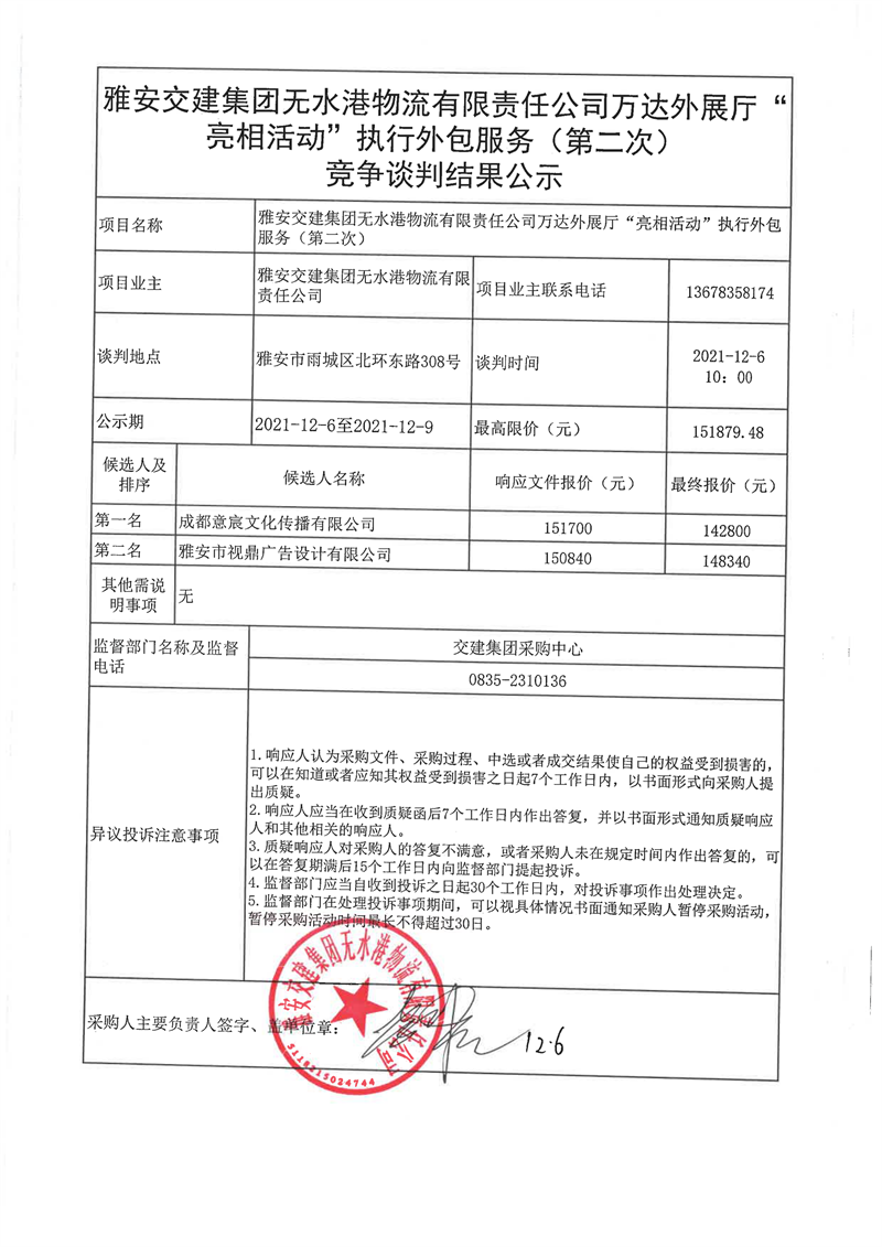 雅安交建集團無水港物流有限責任公司萬達外展廳“亮相活動”執(zhí)行外包服務(第二次)競爭談判結果公示