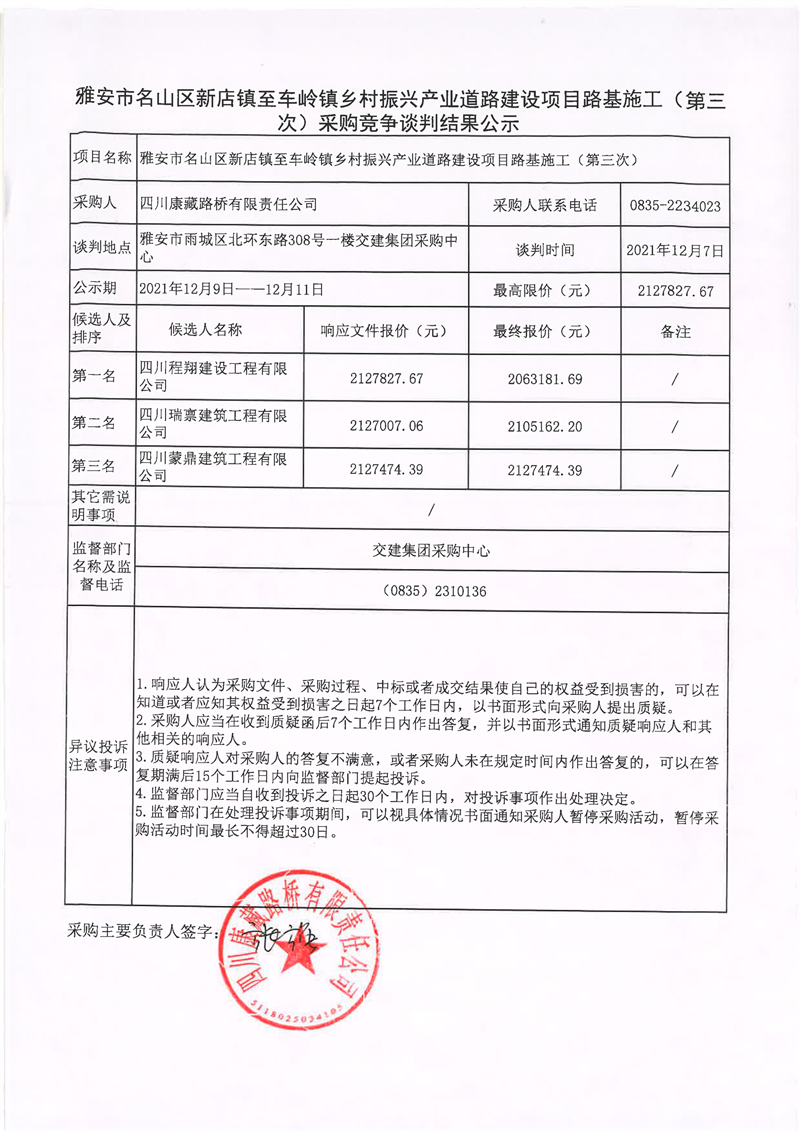 四川康藏路橋有限責(zé)任公司雅安市名山區(qū)新店鎮(zhèn)至車嶺鎮(zhèn)鄉(xiāng)村振興產(chǎn)業(yè)道路建設(shè)項目路面施工(第三次)采購競爭談判結(jié)果公示