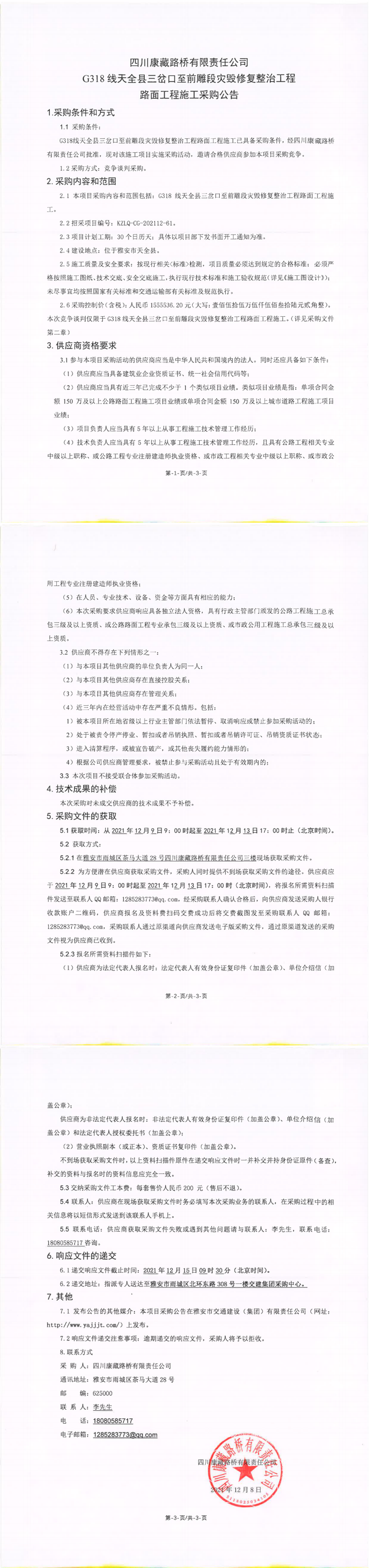 四川康藏路橋有限責(zé)任公司G318線天全縣三岔口至前雕段災(zāi)毀修復(fù)整治工程路面工程施工采購公告