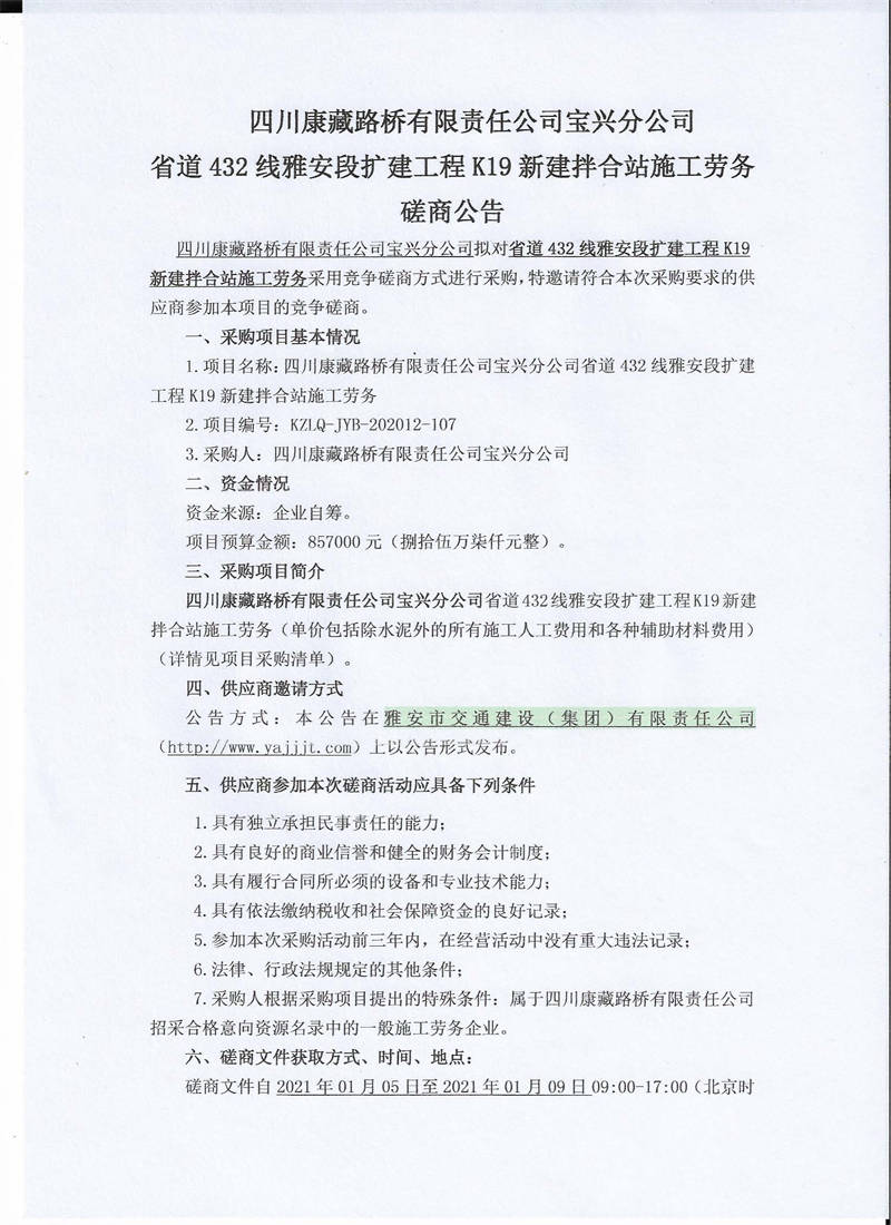 四川康藏路橋有限責任公司寶興分公司省道432線雅安段擴建工程K19新建拌合站施工勞務磋商公告(第二次)