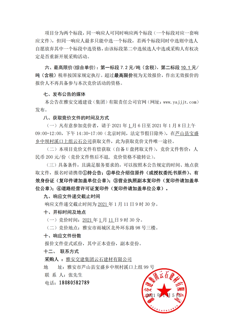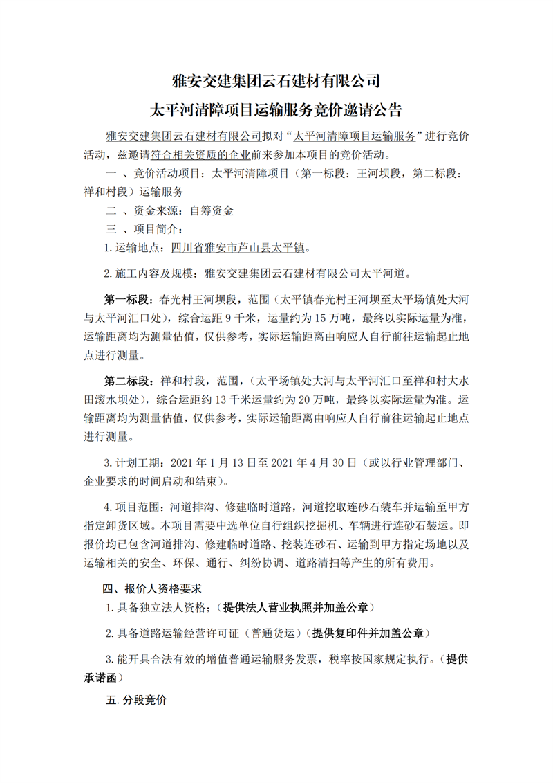 雅安交建集團云石建材有限公司太平河清障項目運輸服務競價邀請公告