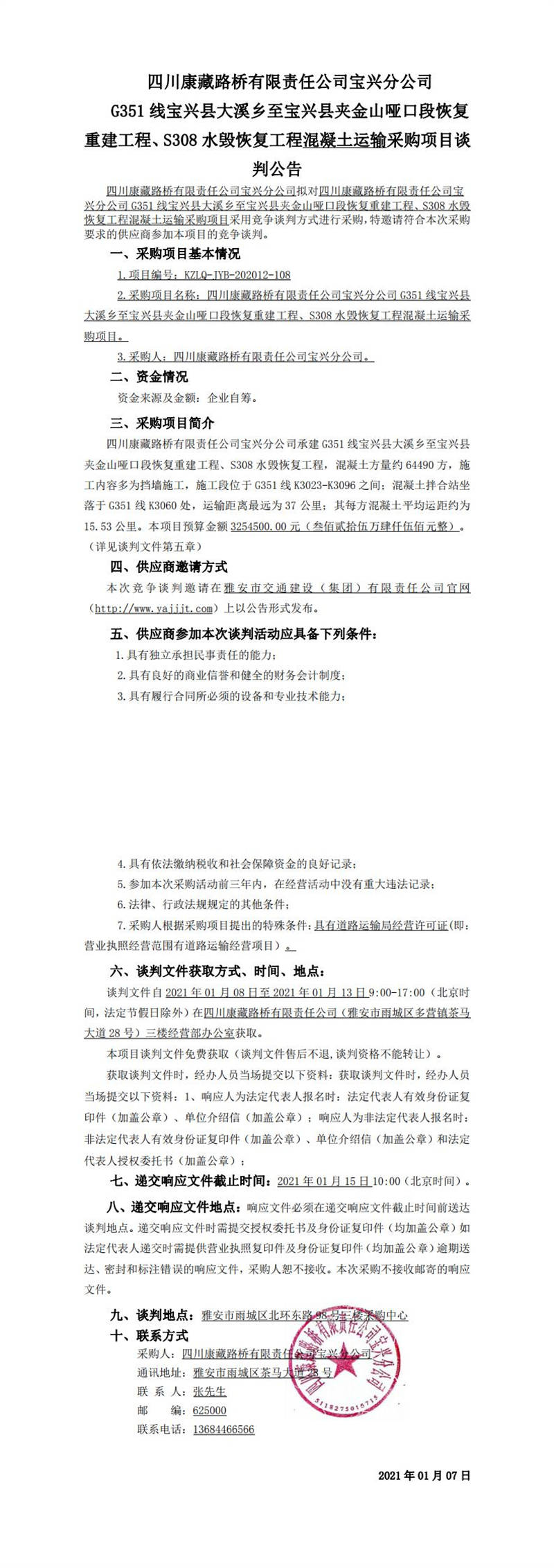 四川康藏路橋有限責任公司寶興分公司G351線寶興縣大溪鄉(xiāng)至寶興縣夾金山啞口段恢復(fù)重建工程、S308水毀恢復(fù)工程混凝土運輸采購項目談判公告