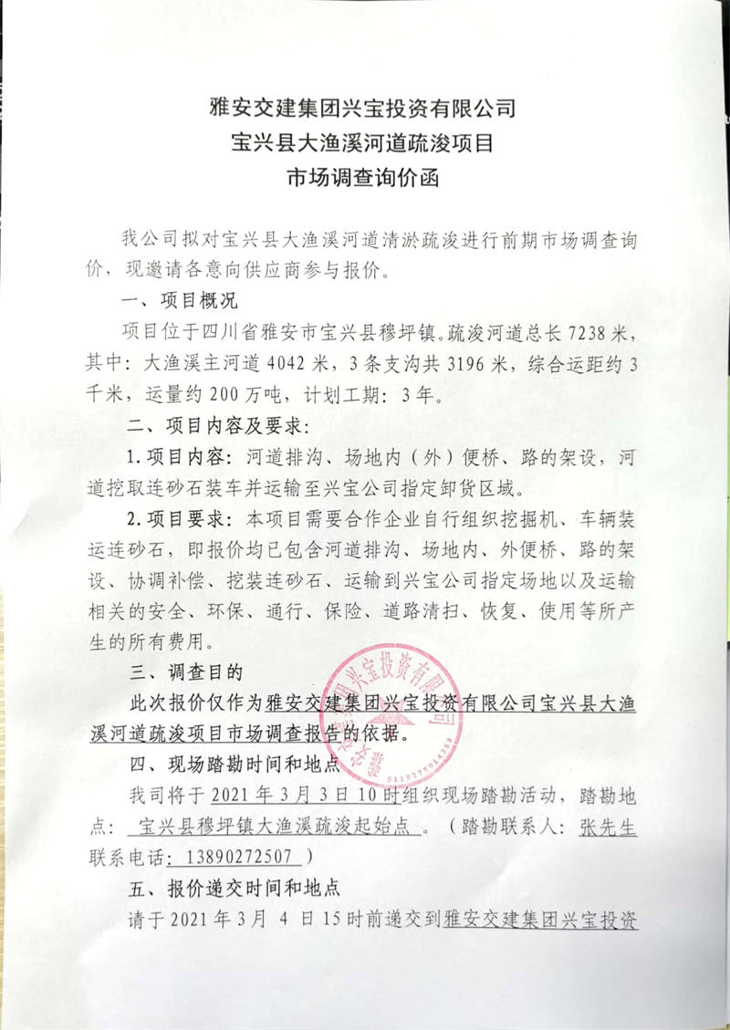 雅安交建集團(tuán)興寶投資有限公司寶興縣大漁溪河道疏浚項(xiàng)目市場調(diào)查詢價公告