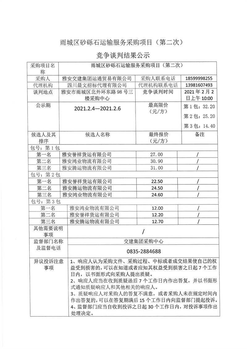 雅安交建集團運通貿易有限公司雨城區(qū)砂礫石運輸服務采購項目(第二次)競爭談判結果公示