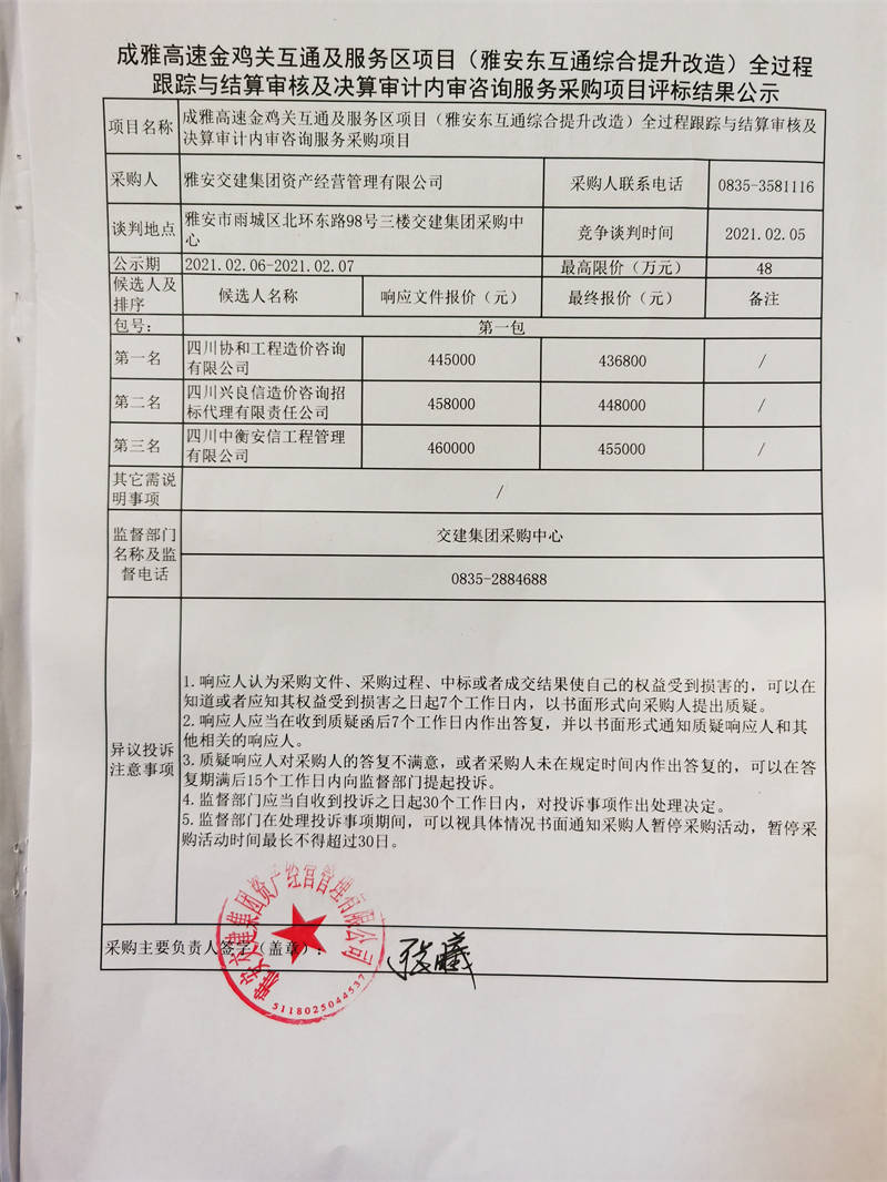 雅安交建集團(tuán)資產(chǎn)經(jīng)營(yíng)管理有限公司成雅高速金雞關(guān)互通及服務(wù)區(qū)項(xiàng)目(雅安東互通綜合提升改造)全過(guò)程跟蹤與結(jié)算審核及決算審計(jì)內(nèi)審咨詢(xún)服務(wù)評(píng)標(biāo)結(jié)果公示