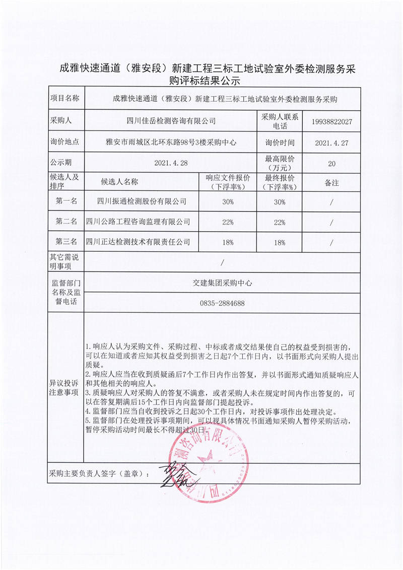 四川佳岳檢測咨詢有限公司成雅快速通道(雅安段)新建工程三標(biāo)工地試驗室外委檢測服務(wù)采購評標(biāo)結(jié)果公示