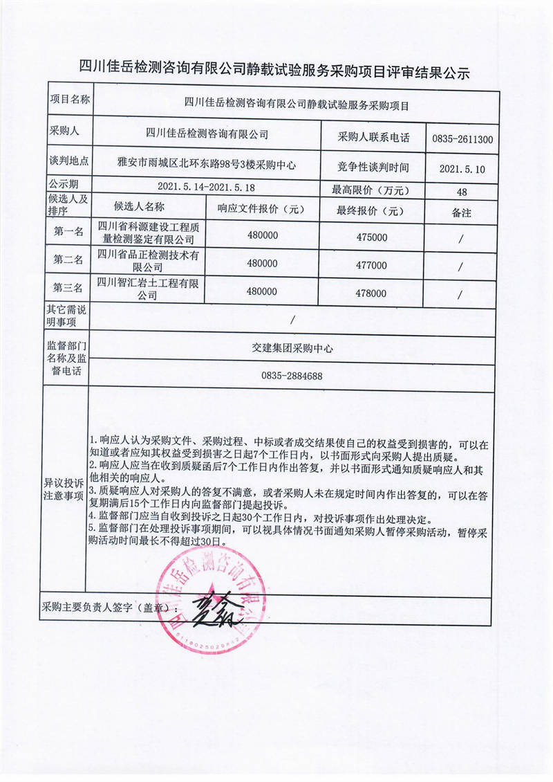 四川佳岳檢測咨詢有限公司靜載試驗服務(wù)采購項目評審結(jié)果公示
