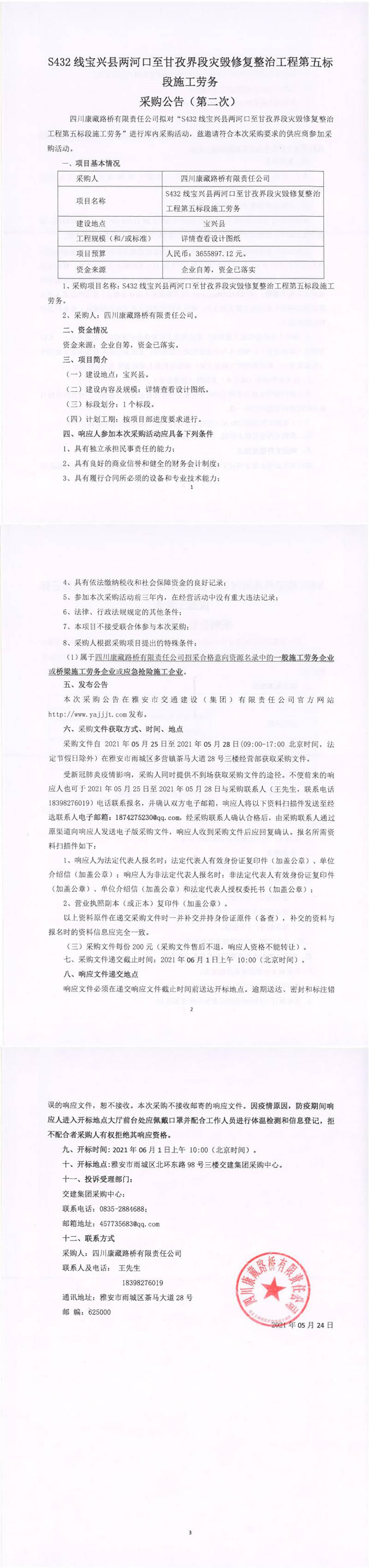 四川康藏路橋有限責任公司S432線寶興縣兩河口至甘孜界段災(zāi)毀修復整治工程第五標段施工勞務(wù)采購公告(第二次)
