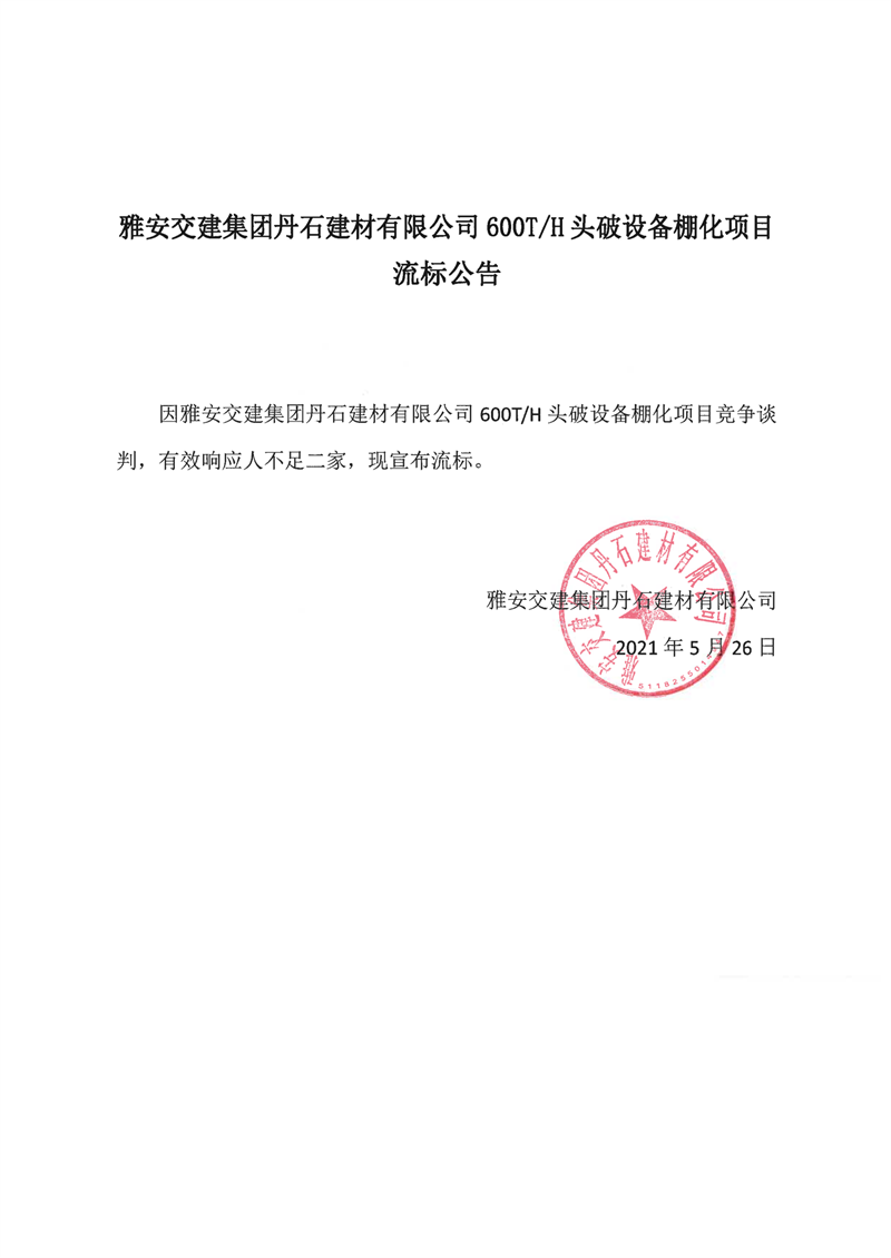 雅安交建集團丹石建材有限公司600T/H頭破設備棚化項目流標公告