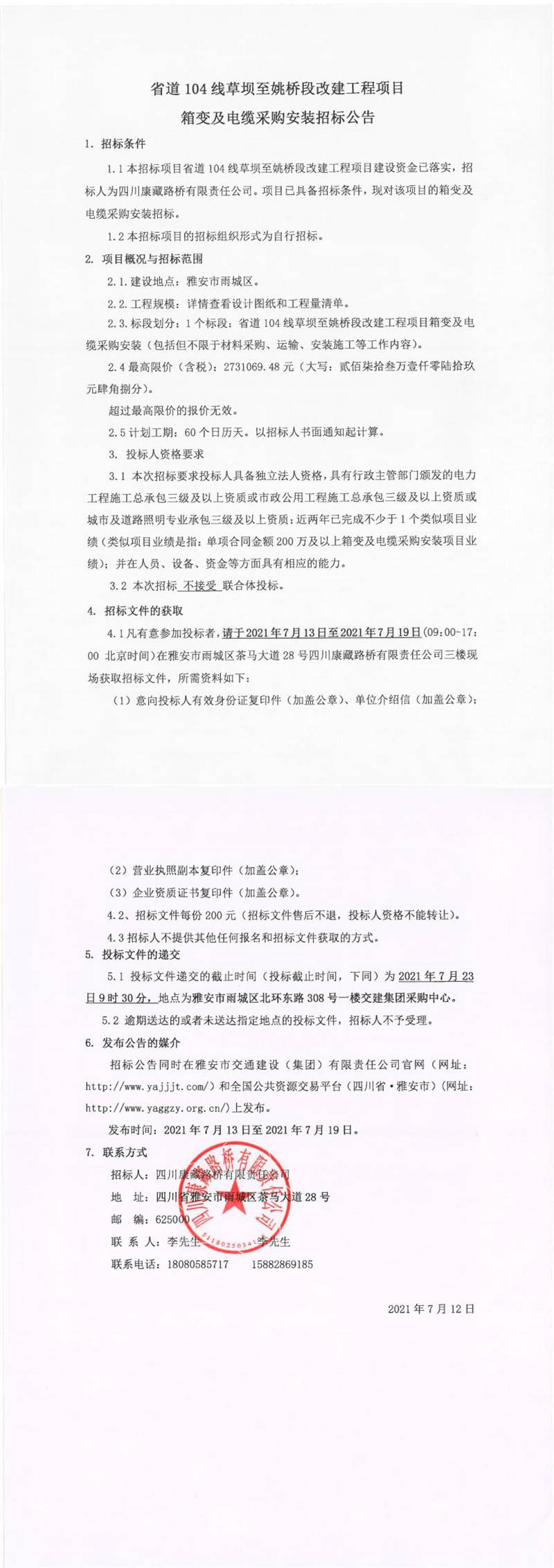 四川康藏路橋有限責(zé)任公司省道104線(xiàn)草壩至姚橋段改建項(xiàng)目箱變及電纜采購(gòu)安裝招標(biāo)公告
