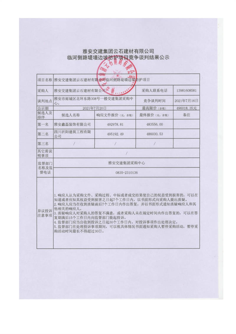 雅安交建集團(tuán)云石建材有限公司臨河側(cè)路堤墻邊坡防護(hù)項(xiàng)目競爭談判結(jié)果公示