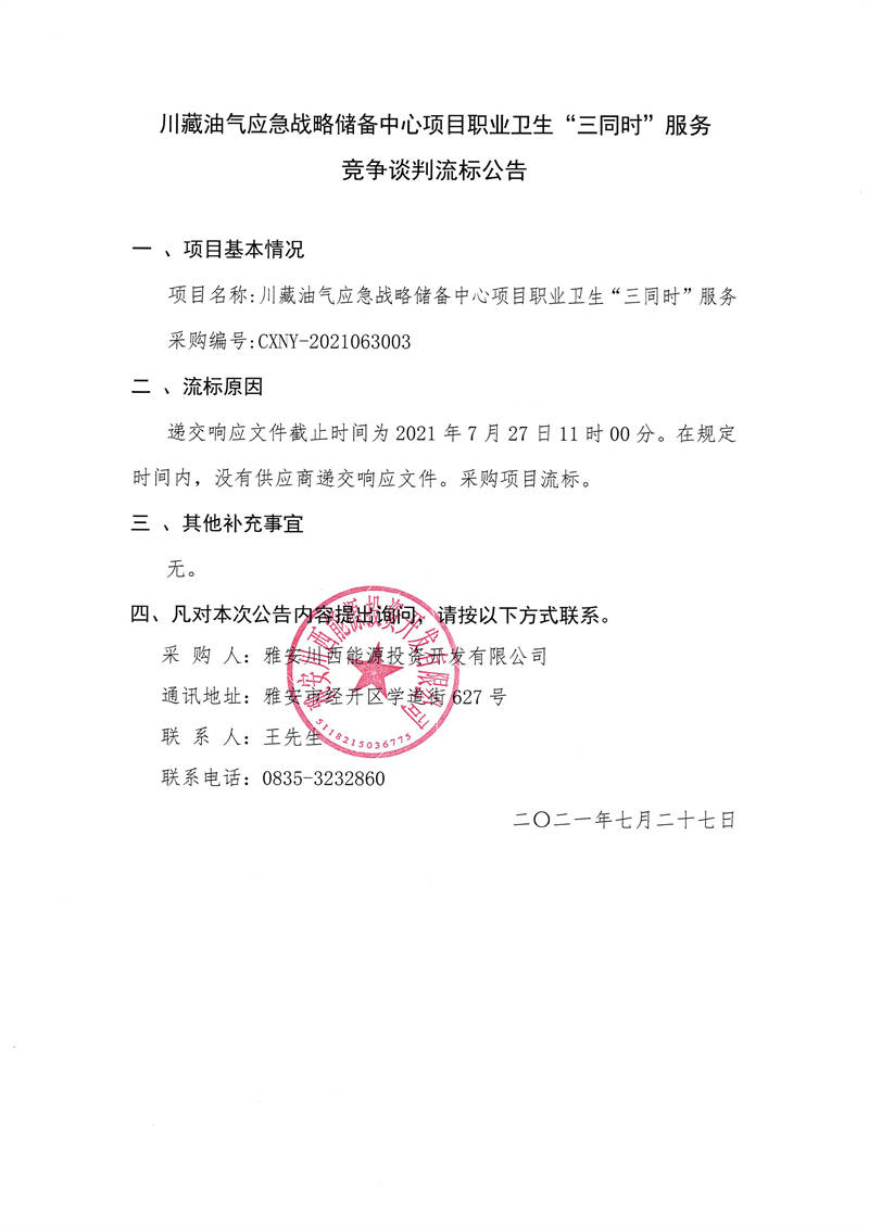 雅安川西能源投資開發(fā)有限公司川藏油氣應(yīng)急戰(zhàn)略儲(chǔ)備中心項(xiàng)目職業(yè)衛(wèi)生“三同時(shí)”服務(wù)競爭談判流標(biāo)公告