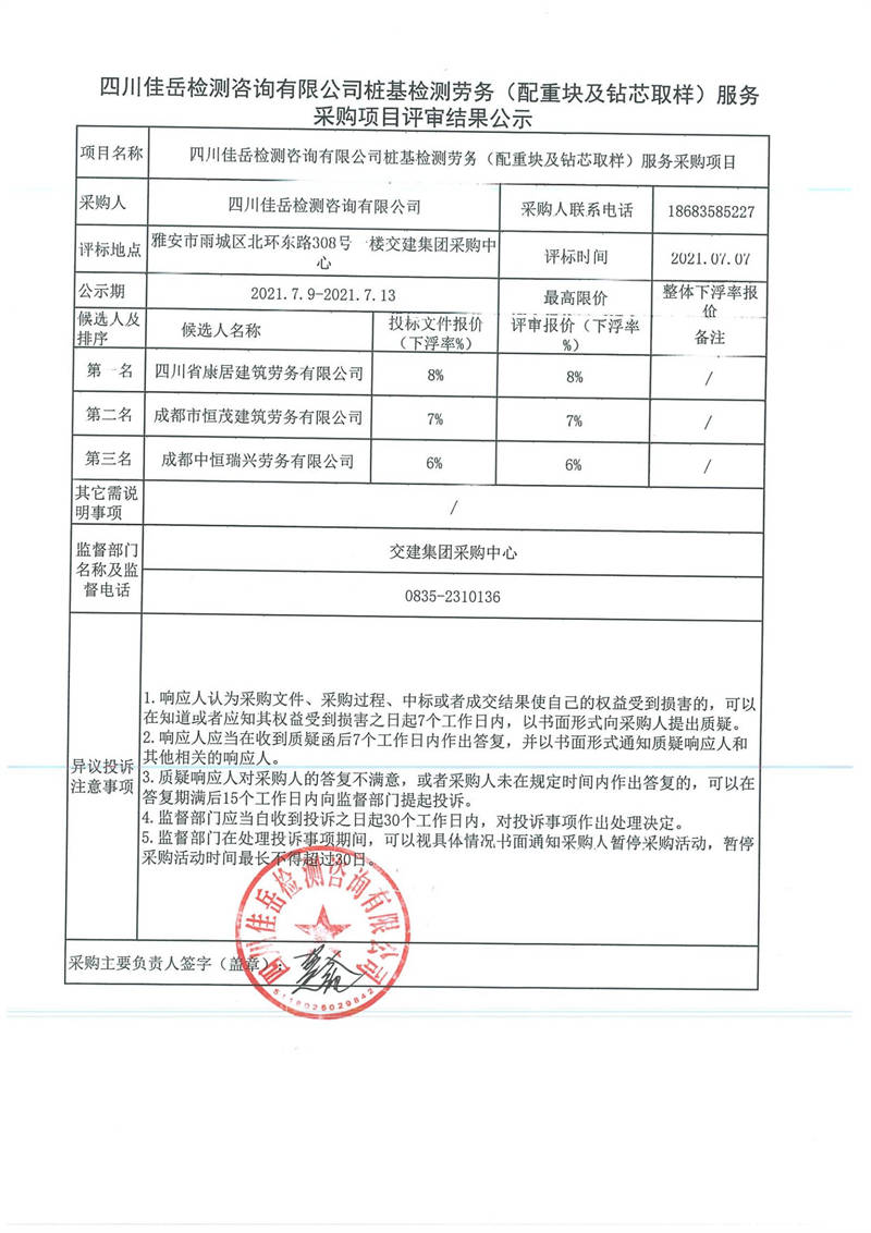 四川佳岳檢測(cè)咨詢有限公司樁基檢測(cè)勞務(wù)(配重塊及鉆芯取樣)服務(wù)采購(gòu)項(xiàng)目評(píng)審結(jié)果公示