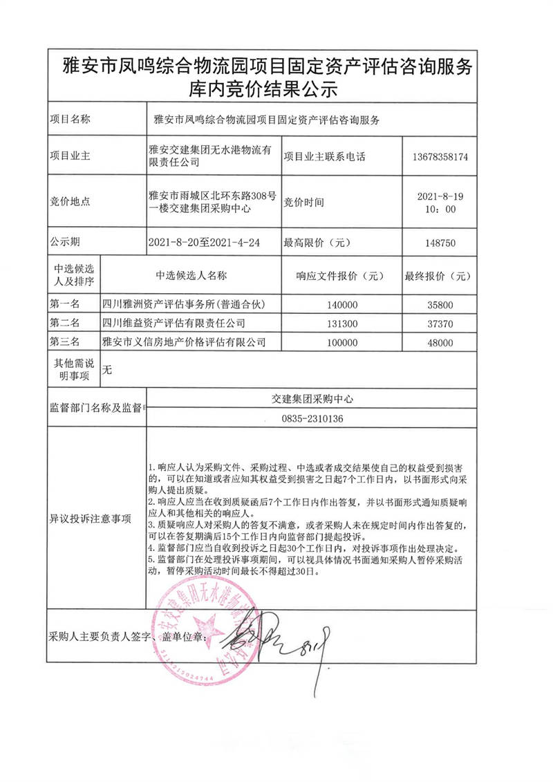 雅安交建集團無水港物流有限責任公司雅安市鳳鳴綜合物流園項目固定資產(chǎn)評估咨詢服務(wù)庫內(nèi)競價結(jié)果公示