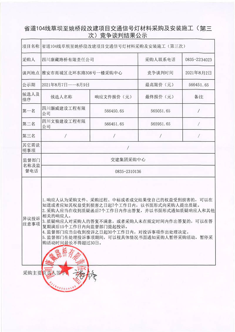 四川康藏路橋有限責(zé)任公司省道104線草壩至姚橋改建項目交通信號燈材料采購及安裝施工(第三次)競爭談判結(jié)果公示