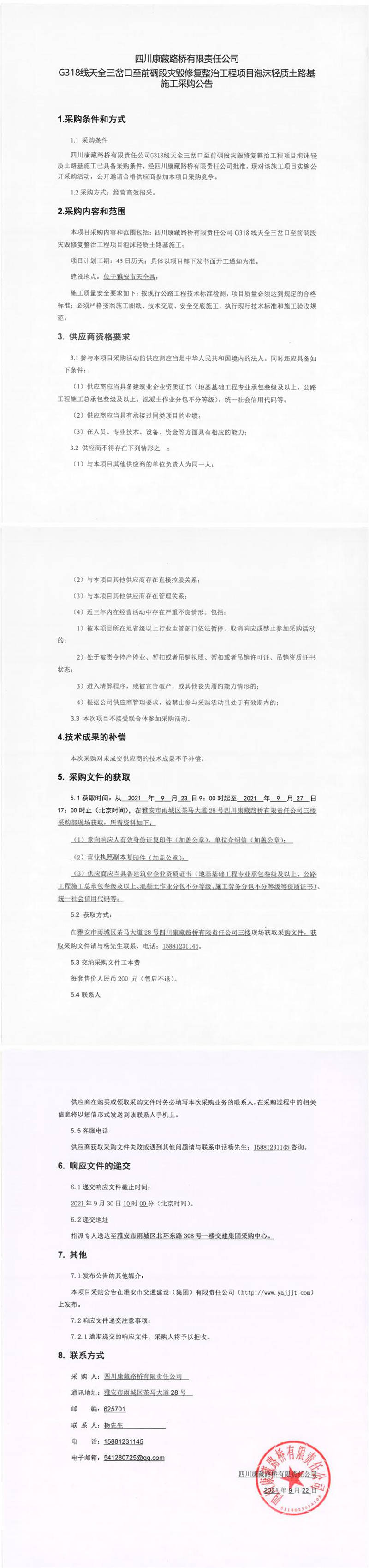 四川康藏路橋有限責任公司G318線天全三岔口至前碉段災(zāi)毀修復(fù)整治工程項目泡沫輕質(zhì)土路基施工采購公告