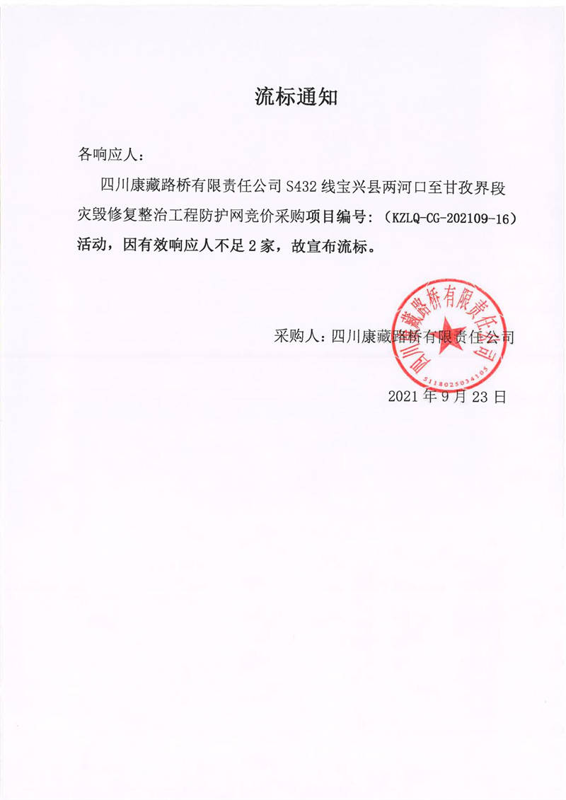 四川康藏路橋有限責任公司S432線寶興縣兩河口至甘孜界段災毀修復整治工程防護網(wǎng)采購流標通知