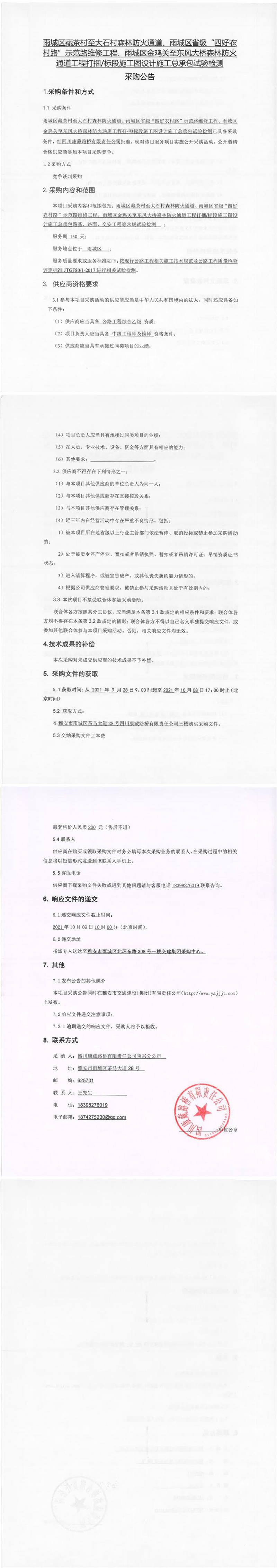 四川康藏路橋有限責(zé)任公司雨城區(qū)藏茶村至大石村森林防火通道、雨城區(qū)省級“四好農(nóng)村路”示范路維修工程、雨城區(qū)金雞關(guān)至東風(fēng)大橋森林防火通道工程打捆/標(biāo)段施工圖設(shè)計施工總承包試驗(yàn)檢測采購公告