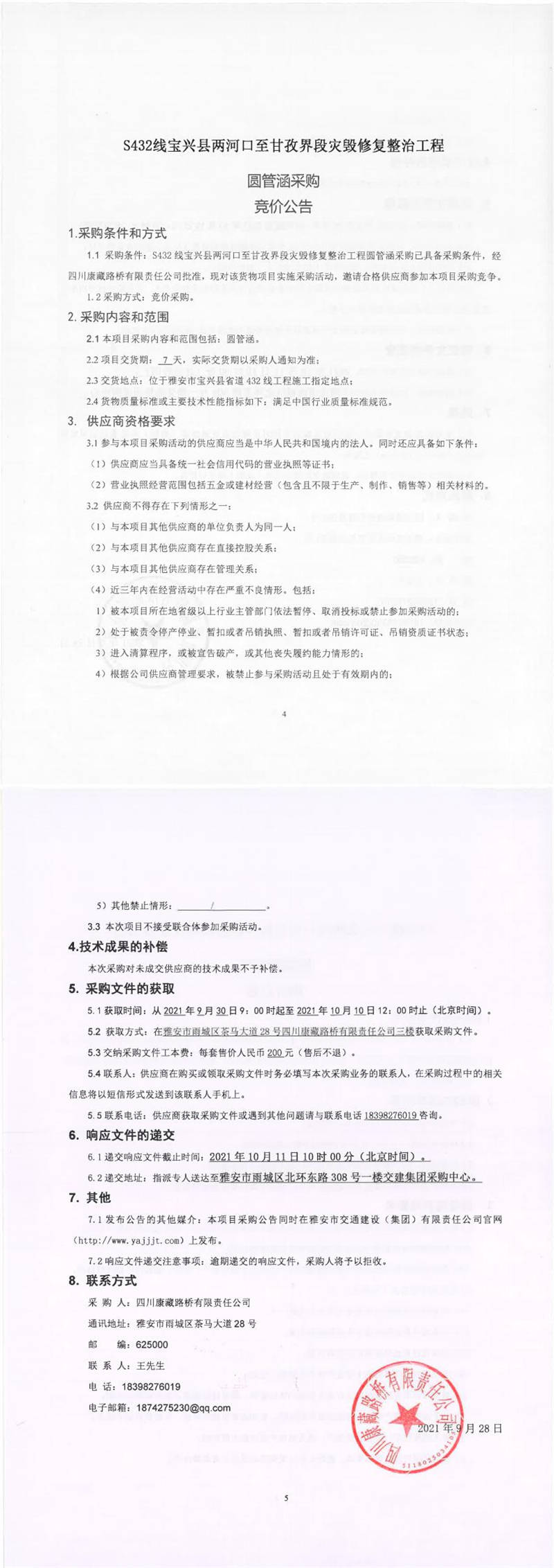 四川康藏路橋有限責(zé)任公司S432線寶興縣兩河口至甘孜界段災(zāi)毀修復(fù)整治工程圓管涵采購競價公告