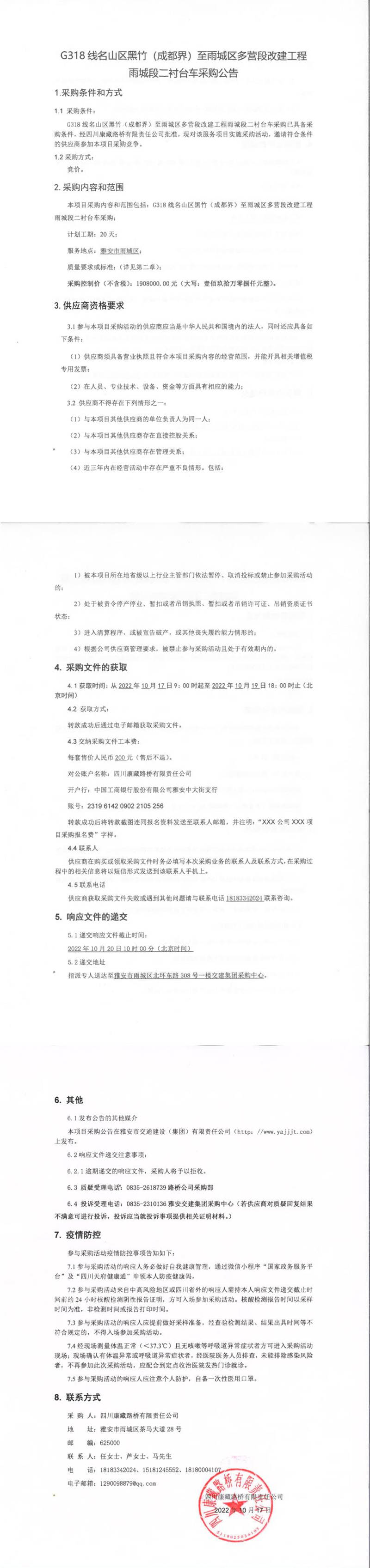 四川康藏路橋有限責(zé)任公司G318線名山區(qū)黑竹(成都界)至雨城區(qū)多營(yíng)段改建工程雨城段二襯臺(tái)車采購(gòu)公告