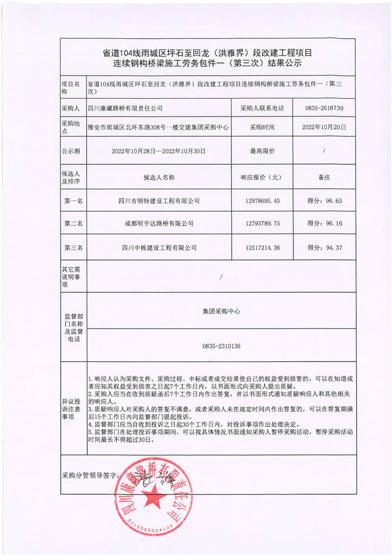 四川康藏路橋有限責任公司省道104線雨城區(qū)坪石至回龍(洪雅界)段改建工程項目連續(xù)鋼構橋梁施工勞務包件一(第三次)結果公示