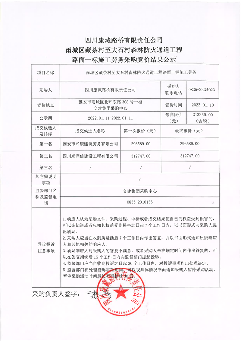 四川康藏路橋有限責任公司雨城區(qū)藏茶村至大石村森林防火通道工程路面一標施工勞務(wù)采購競價結(jié)果公示
