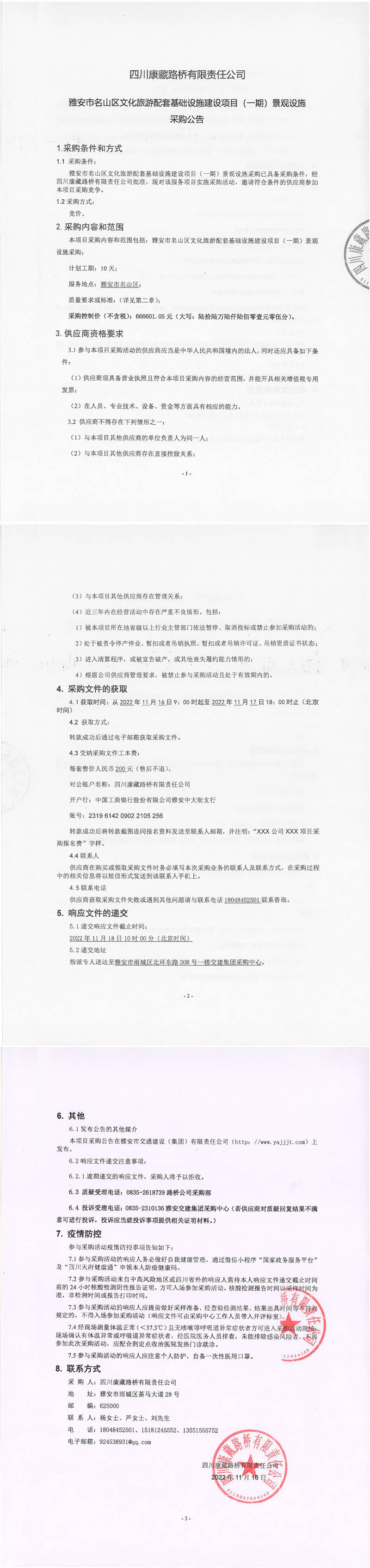 四川康藏路橋有限責任公司雅安市名山區(qū)文化旅游配套基礎(chǔ)設(shè)施建設(shè)項目(一期)景觀設(shè)施采購公告
