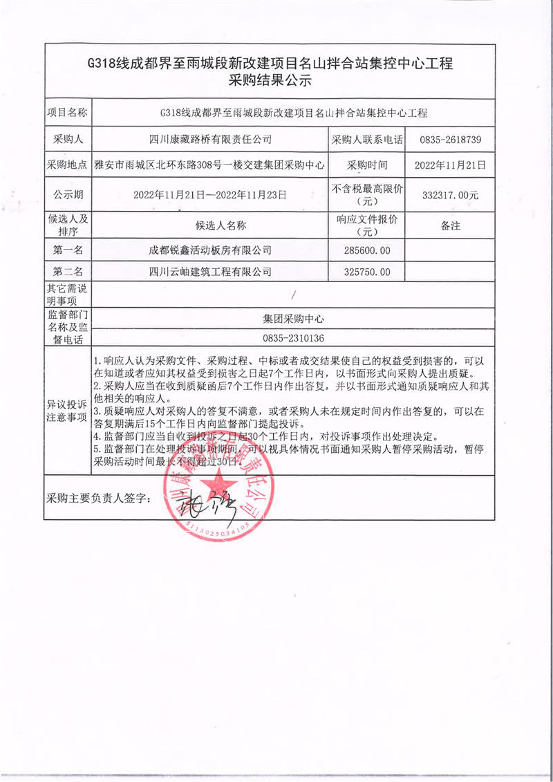 四川康藏路橋有限責任公司G318線成都界至雨城段新改建項目名山拌合站集控中心工程采購結果公示