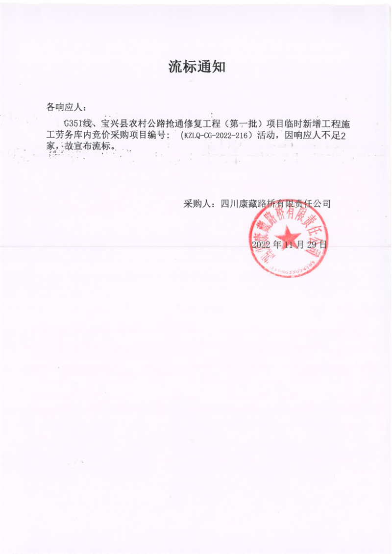 四川康藏路橋有限責任公司G351線、寶興縣農村公路搶通修復工程(第一批)項目臨時新增工程施工勞務庫內競價采購流標通知