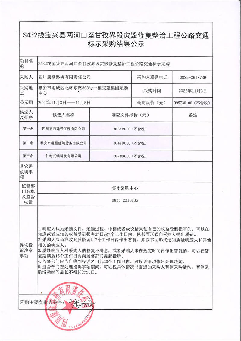 四川康藏路橋有限責(zé)任公司S432線寶興縣兩河口至甘孜界段災(zāi)毀修復(fù)整治工程公路交通標(biāo)示采購(gòu)結(jié)果公示