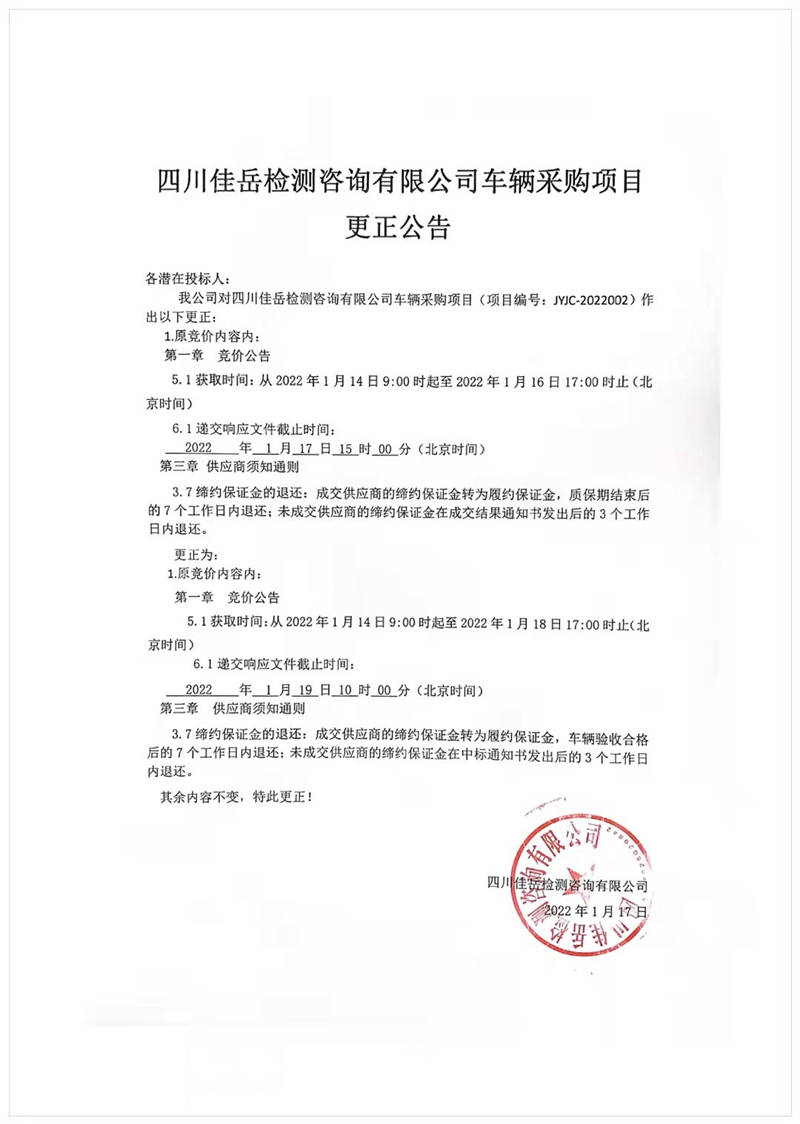 四川佳岳檢測(cè)咨詢有限公司車輛采購項(xiàng)目更正公告
