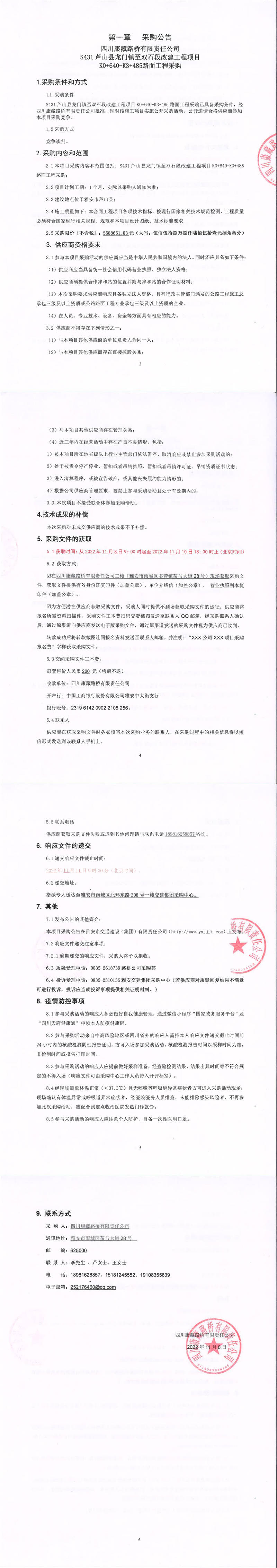 四川康藏路橋有限責(zé)任公司S431蘆山縣龍門鎮(zhèn)至雙石段改建工程項(xiàng)目K0+640-K3+485路面工程采購(gòu)公告