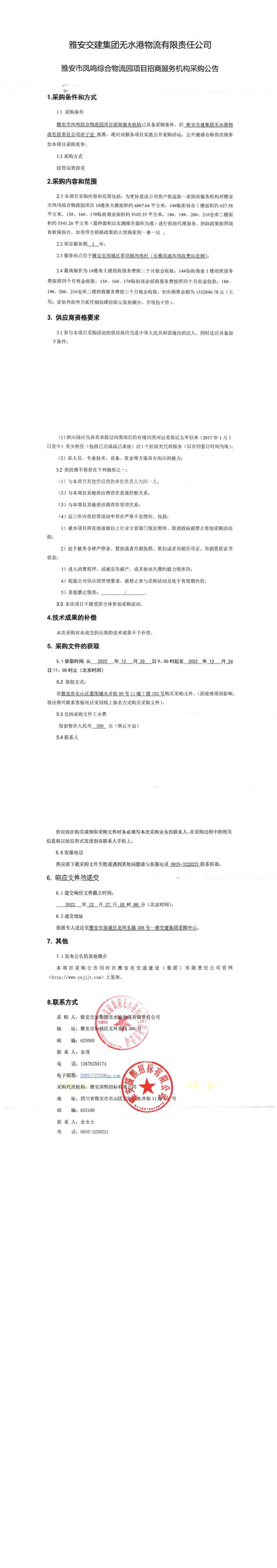雅安交建集團無水港物流有限責(zé)任公司雅安市鳳鳴綜合物流園項目招商服務(wù)機構(gòu)采購公告