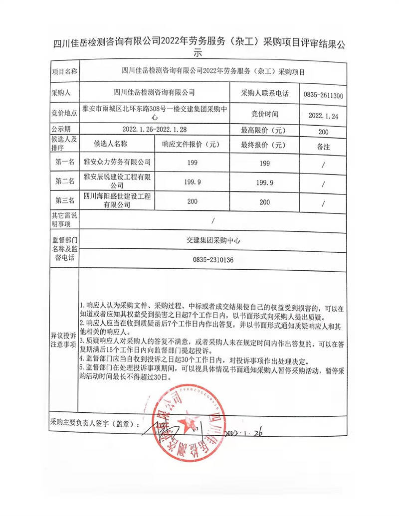四川佳岳檢測咨詢有限公司2022年勞務服務(雜工)采購項目評審結(jié)果公示