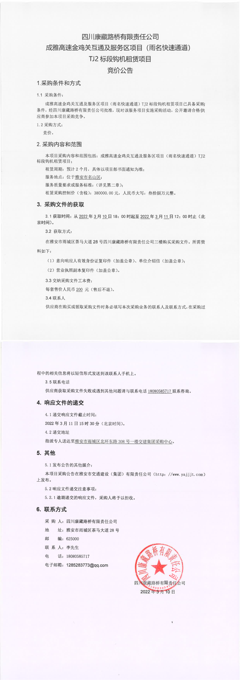 四川康藏路橋有限責(zé)任公司成雅高速金雞關(guān)互通及服務(wù)區(qū)項目(雨名快速通道)TJ2標段鉤機租賃項目競價公告