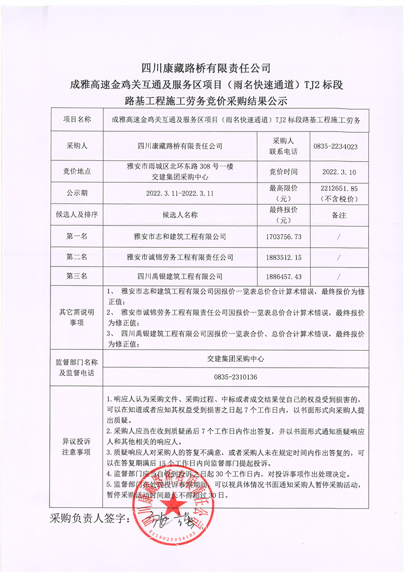 四川康藏路橋有限責(zé)任公司成雅高速金雞關(guān)互通及服務(wù)區(qū)項(xiàng)目(雨名快速通道)TJ2標(biāo)段路基工程施工勞務(wù)競價(jià)采購結(jié)果公示