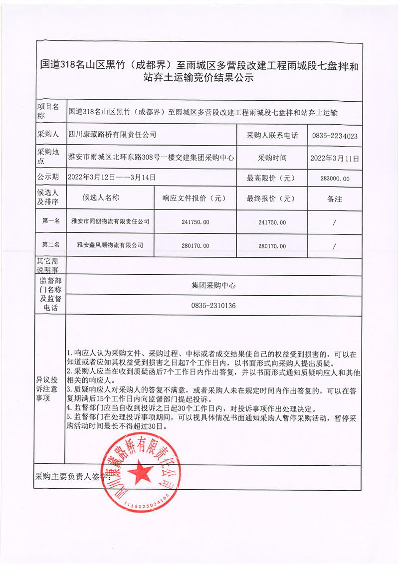 四川康藏路橋有限責(zé)任公司國(guó)道318名山區(qū)黑竹(成都界)至雨城區(qū)多營(yíng)段改建工程雨城段七盤(pán)拌和站棄土運(yùn)輸競(jìng)價(jià)結(jié)果公示